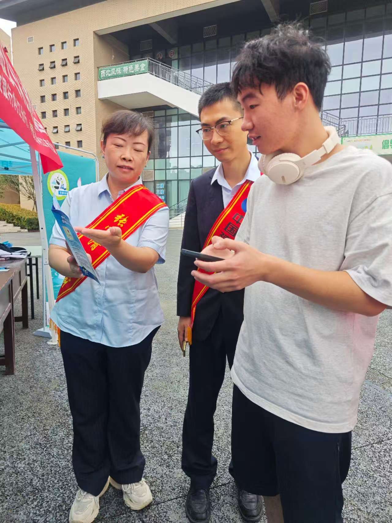 参观学习结束后,基地、经济与管理学院、中国人寿内江分公司与中国建设银行内江分行的宣传人员来学校一食堂外广场精心布置宣传展位。图文并茂的展架、醒目有力的宣传标语,吸引了同学们的目光。宣传人员积极向同学们发放清廉金融文化宣传折页,耐心解答疑问,并邀请大家扫码参与清廉知识线上测试,现场互动氛围浓厚。同学们踊跃参与,或驻足细读展板内容,或认真思考测试题目,在轻松的氛围中学习清廉知识,感悟廉洁文化。活动中,宣传人员结合金融行业特点,向师生们深入浅出地阐释了中国特色金融文化“五要五不要”的核心精神理念,让廉洁从业的种子在青年学子心中悄然萌芽。