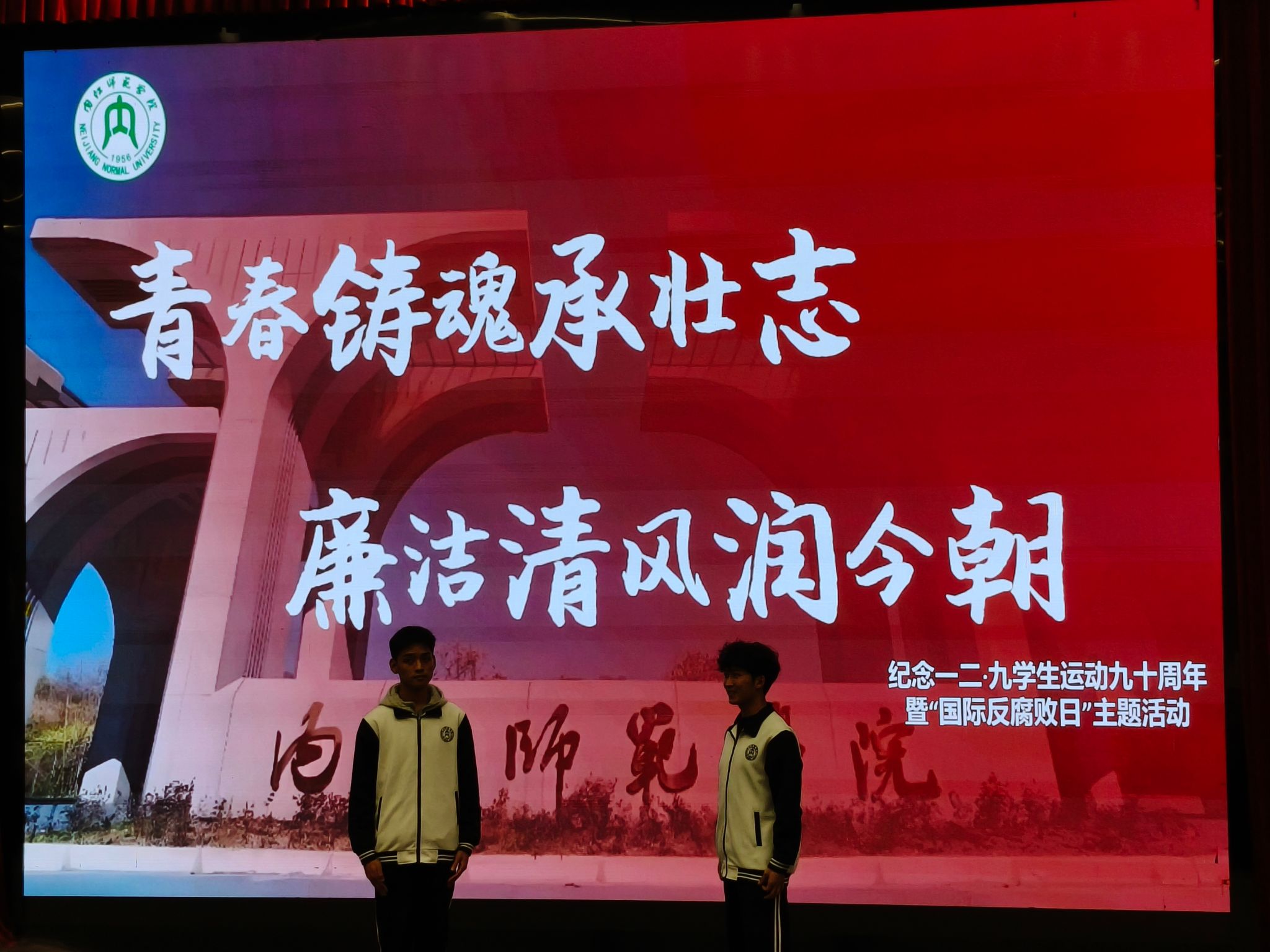 活动通过多元形式开展沉浸式学习教育。视频学习环节带领师生回溯1935年北平学子发起爱国运动的热血场景;文艺展演精彩纷呈,《青春剑为犁》的激昂朗诵、《清风与烽火》的情景演绎、《烽火秋华》的深情合唱、《跨越时空的书信》的代际对话以及《如愿》的全场合唱,生动诠释了青春与家国的联结,爱国与廉洁精神的融合。知识竞答环节气氛热烈,选手踊跃抢答、对答如流,进一步深化了大家对一二·九学生爱国运动与“国际反腐败日”的认知。
