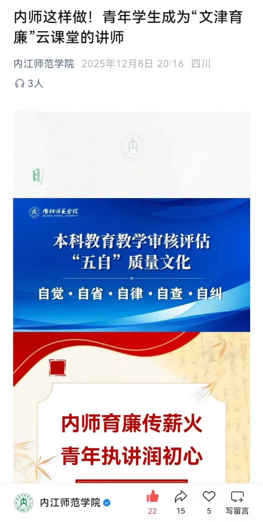 “文津育廉”云课堂,青年学生从内师校园景观入手,从“水晶莲花”图书馆、竹、孺子牛等代表廉洁意向的自然景观到讲述陶行知、范长江、孔子、苌弘等廉洁人物故事,掀起了“爱廉说”。廉洁文化社科普及基地遴选出部分精品微课在基地网站、基地微信公众号、学校微信公众号等云端和校园宣传大屏展示,以青年大学生的澄澈与纯粹,阐释廉洁理念,讲述廉洁故事,普及廉洁知识。