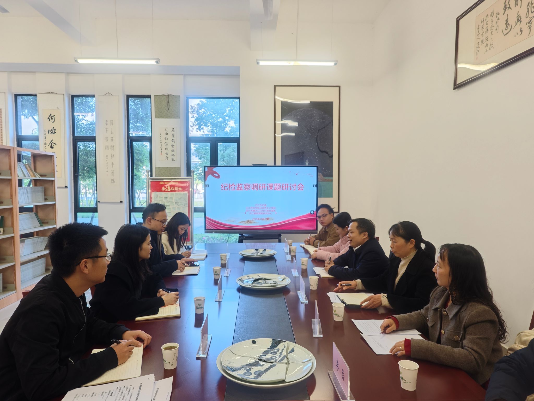 为切实加强校地合作,2025年11月27日,内江市纪委监委组织部部长唐琳、法规研究室主任罗世杰一行人到廉洁文化社科普及基地开展工作调研交流。马克思主义学院院长谭安富、基地主任黄平、马克思主义学院副院长管银凤、教育科学学院博士罗利及部分教师代表参加了本次纪检监察课题研讨会,会议由谭安富主持。